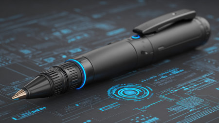 High-tech, matte black writing instrument, possibly a smart pen or stylus, features subtle blue accent lighting near its tip and on its body, resting diagonally across a dark, textured surface overlaid with glowing, bright blue schematic or circuit board patterns, suggesting themes of advanced technology and digital creation.
