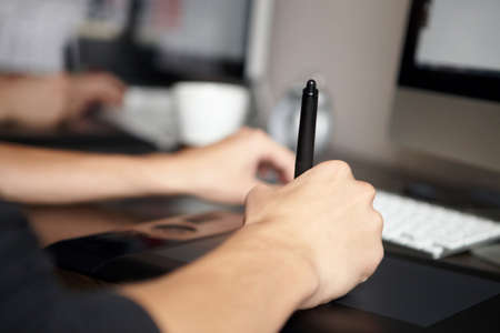 Close-up detail view of graphic designers and 3d program animators hand, work on graphic tablet and computers in the office
