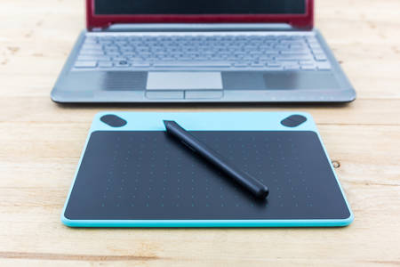 Image of a graphics tablet, stylus and laptop on a wooden table. Designer workplace. Freelance. Retouching. IT concept. Mixed media