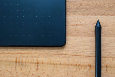 Concept artist desktop. Graphics tablet on wooden table. View from above. Warm tones and colors