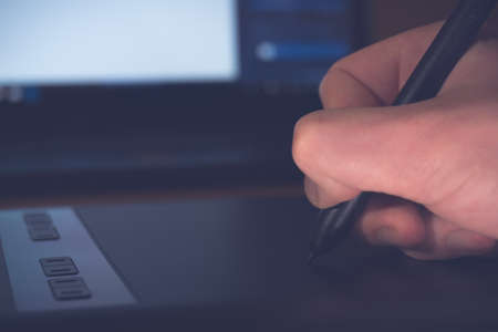 Retro image of male hand of a designer drawing with the stylus on a grey graphics tablet, close-up.