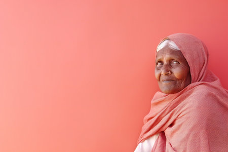 The elderly Afghanistan woman 75 years old gazes thoughtfully into the distance, her face marked by life experiences. She wears a traditional headscarf, set against a rustic background. Generative AI.