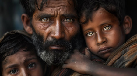 A man with a beard and two children in front of him, AI