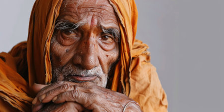 an Indian elderly person with a thoughtful expression on a studio background