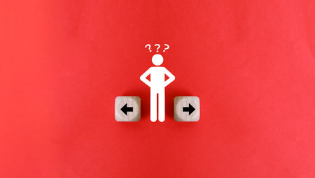In making a choice in career or other aspects of life, a thoughtful young woman is surrounded by drawn arrows set against a pink background.