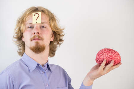 Young guy playing with human brain model. Man discovering innovation and thinking having question mark on his head.