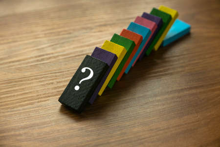 A variety color of fallen wooden domino with a symbol of question on wooden background.