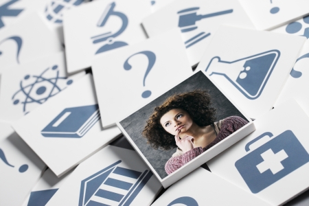 Concept illustration of a person at a blackboard with question marks, symbolizing confusion, decision making, and searching for answers