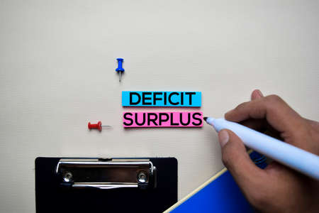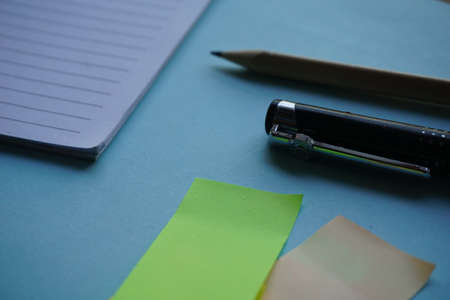 A high angel shot of a notebook pen pencil and colored note blank on blue table