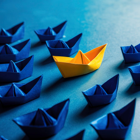 Set of origami boats. One Yellow paper boat leading among Blue ships on blue background