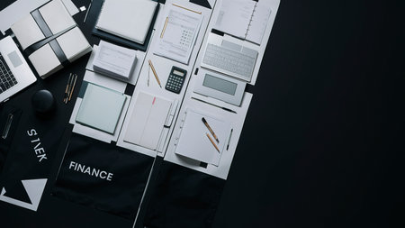 Stylish red coffee cup, phone and laptop on desk table. Black background, business concept, close up, top view