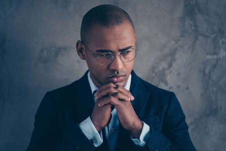 Close up photo portrait of cool modern masculine virile banker manager marketer holding hands palms together looking aside isolated grey background.