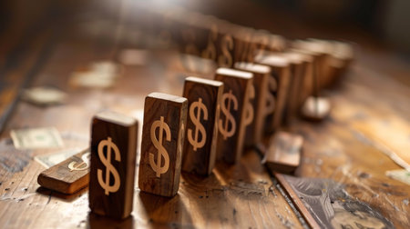 Dominoes with Dollar Signs Toppling on Wooden Surface Symbolizing Economic Impact