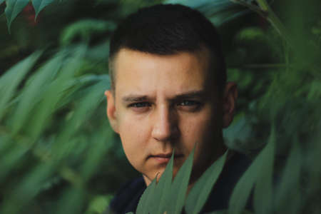 young handsome serious man is sitting at office desk in workstation and looking thoughtfully at laptop screen