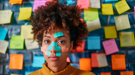 A vibrant collection of sticky notes and papers arranged on a wooden table showcases a collaborative brainstorming session in a contemporary office. Hands actively engage.