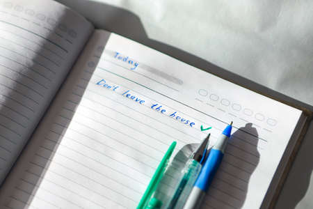Do not leave the house - a call in a notebook, an inscription with green and blue pens in a notebook in a cage. Stay at home during the pandemic.