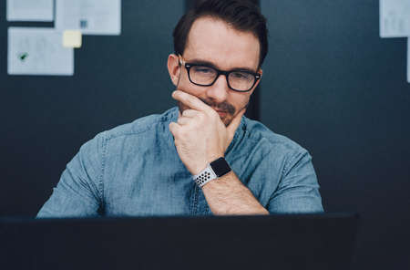 How can I tackle this. a handsome young male architect looking thoughtful while working on a laptop in his office.