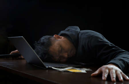 cybercrime suicided after hacking failed and arrested by police, bad hacker in black hoodie dead on the table a gun in right hand and credit card,money,laptop on table. concept for cybercrime,hacker,robber,arrested,suicidal