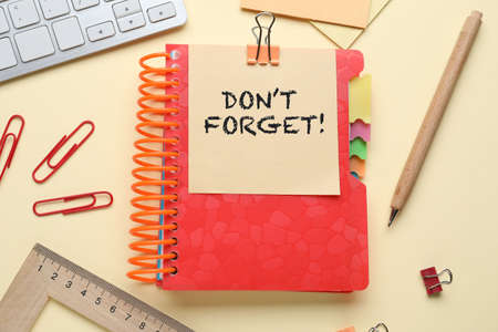 Notebook, paper with text DON'T FORGET and stationery on beige background