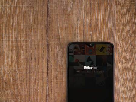 Lod, Israel - July 8, 2020: Adobe Behance app launch screen with logo on the display of a black mobile smartphone on wooden background. Top view flat lay with copy space.
