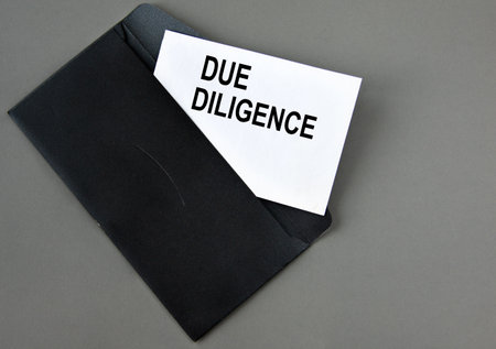 Close-Up of Magnifying Glass with Due Diligence Tag on Gray Background