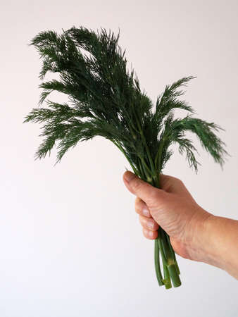 a bunch of fresh dill in a female hand on a white background.