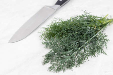 Fresh Dill on the grey marble table with knife in the background.