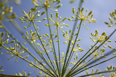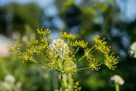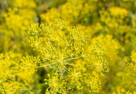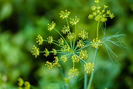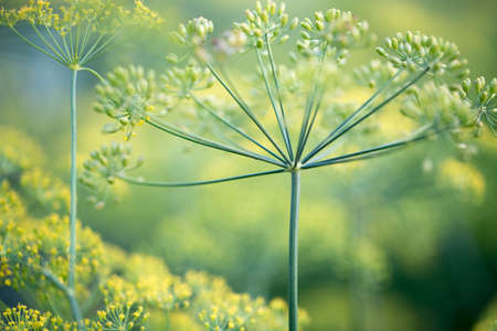 Macro closeup of flowering delicate dill herb cluster flowers growing in garden