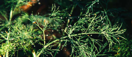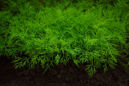 Green dill leaves in the garden. Organic farm. Healthy eating. Foods rich in vitamins. Agricultural industry. Natural background. Fragrant seasoning.