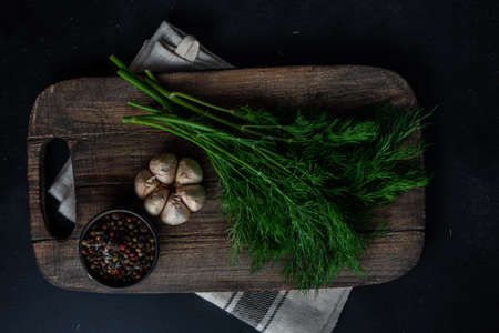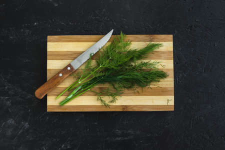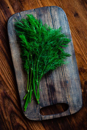 Organic food concept with fresh dill herb on cutting board