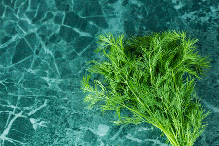 A bunch of fresh dill on marble background. Empty space for text.