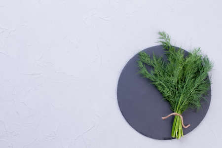 Fresh bunch of dill on round slate. Branches of green dill herbs on stone stand and copy space, top view.