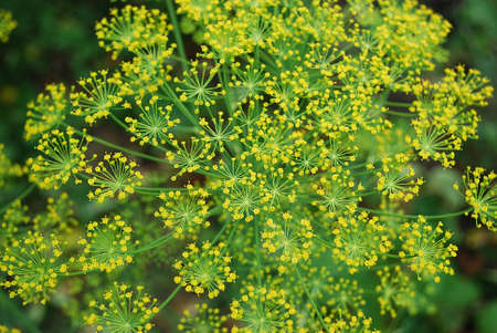 Umbrellas of dill with small yellow flowers close-up in the summer, texture background.