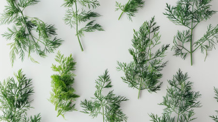 Fresh organic dill herbs displayed with vibrant green hues on a clean white background for culinary inspiration and decoration.