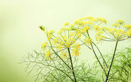 Close up blossoming branch of fennel on light green background.Selective focus depth of field.