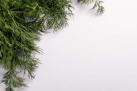 Composition with springs of fresh dill on white background, closeup