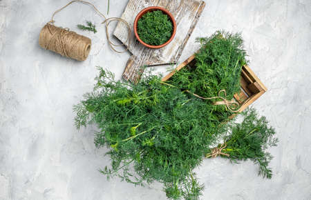 Fresh dill close up on wooden box on light background, preparation for freezing serving size organic healthy ething natural product portion. place for text.