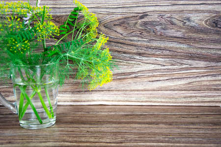 Dill in a glass glass on a wooden background. Fragrant greens in the water.