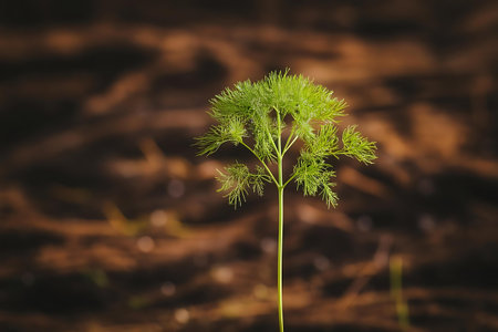 The Fennel in spring, fresh green leaves, soft sunlight filtering, vibrant atmosphere full of vitality, natural textures, serene mood.