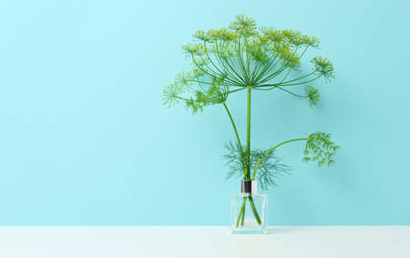 glass vase with a bouquet of dill on a white table. Minimalism in the interior