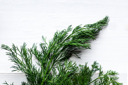 Fresh green dill on a white wooden background. Top view. Copy, empty space for text.