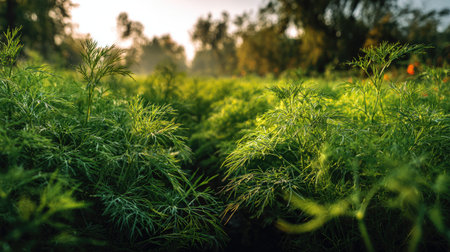 A panoramic wide view of Dill garden growing closely together at dawn gentle morning light illuminating fresh leaves ultra realistic photography cinematic wide composition lifelike natural scene