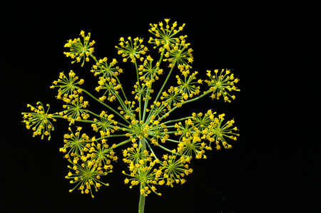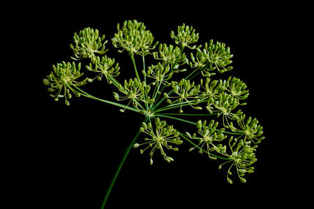 Umbrella flower of Dill, used in kitchen cooking to flavor, isolated on black background