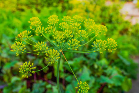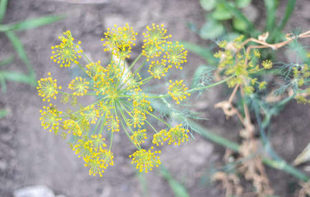 Yellow flowers of dill, Anethum graveolens. close up. In the open ground in the garden grows vegetable dill.