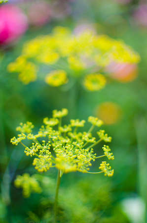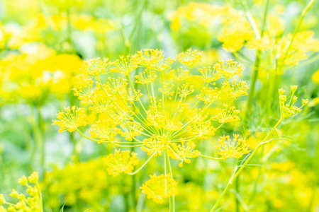 Close up of blooming dill flowers in seasoning kitchen garden. Fresh fennel blossoms on the green colorful bokeh background with the copy space for text. Selective focus