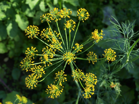 Fresh dill flowers in the garden, fragrant dill seeds close-up