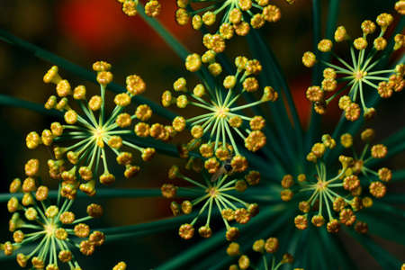 Dill inflorescence close-up. Contrast image. Botanical background. Focus on individual flowers.