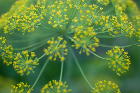 Umbrellas from blooming dill. Yellow flowers on a green background. High quality photo