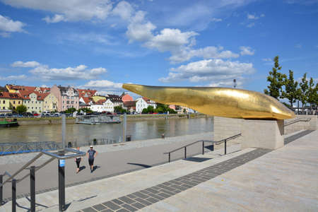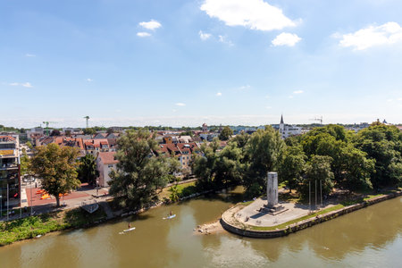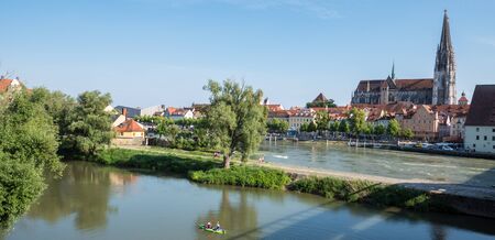 Landscape with view of Regensburg city and Danube river. Medieval architecture with Old Town Hall in the background. Popular tourist places in Regensburg, Bavaria, Germany.