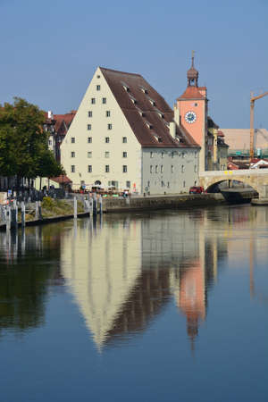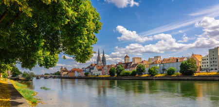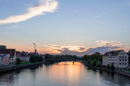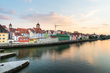 Panoramic view on beautiful Stone Bridge, Cathedral and Old Town. River Danube with colorful reflection, Regensburg, Bavaria, Germany. High quality photo